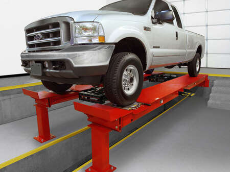 Die Grubenbühnen von Hunter haben eine Hubkraft von 8.164 kg und bieten zwei Luftheber mit einer Tragkraft von 4.082 kg. 4-Rad-Achsvermessungs bis 4.013 mm Radstände können gewartet werden. 2-Rad-Achsvermessungs-Radstände sind nur durch den Raum hinter der Hebebühne begrenzt, da Hinterachsen auf Anfahrbeton aufliegen können.