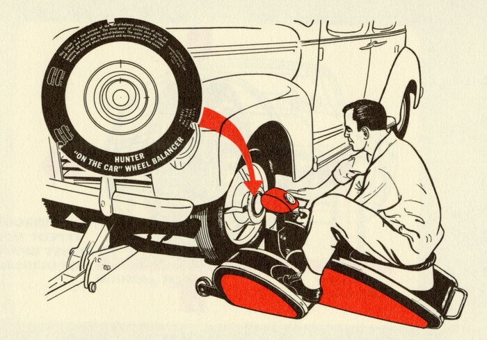 Both the Hunter Tune-In Balancer and the Hunter Electronic Wheel Balance-Indicator balance for kinetic and dynamic out-of-balance conditions in one simple operation, on-the-car, where the wheel can best be balanced. Thereby, eliminating all out-of-balance vibration from the wheel assembly to affect a "motion balance" while the vehicle is in operation. (Illustration shows the Tune-In Balancer in use.)