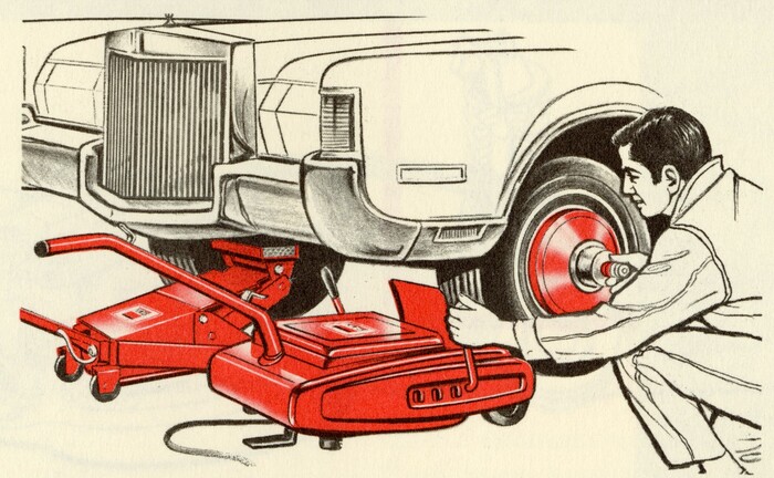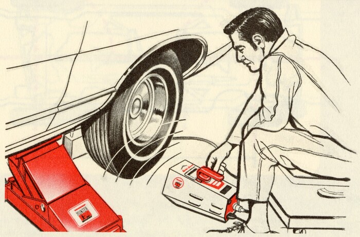 Wheel vibration caused by non-uniformity of tires can be quickly diagnosed and corrected with the Hunter Ride-Perfection Center. Multi-purpose, on-the-vehicle unit dynamically checks tires rotating under normal vehicle load to stimulate actual driving conditions. When pre-set, it automatically and selectively trims inner and outer tire ribs to correct improper tire-uniformity, and accurate, job-finishing wheel-balancing can be performed with built-in 4 H.P. spinner. It is the most-advanced method yet developed to solve vibration problems caused by tire inconsistencies.