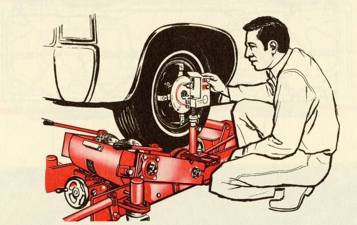 It has become obvious that rear wheel balancing is just as important and necessary as front wheel balancing. It is also best to balance the whole wheel and tire assembly on the vehicle. If a wheel is removed from the hub and drum assembly it should again be checked for balance, because it is being remounted on a different center. (Illustration shows the Hunter "Strobe" Wheel Balance-Indicator in use.)
