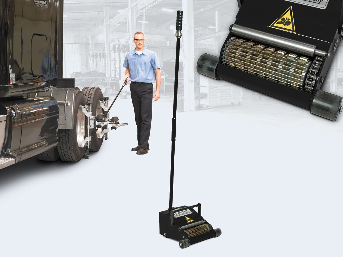 Pchacz firmy Hunter przystawiony do osi tylnej ciężarówki pozwala ją łatwo przetoczyć w celu kompensacji.