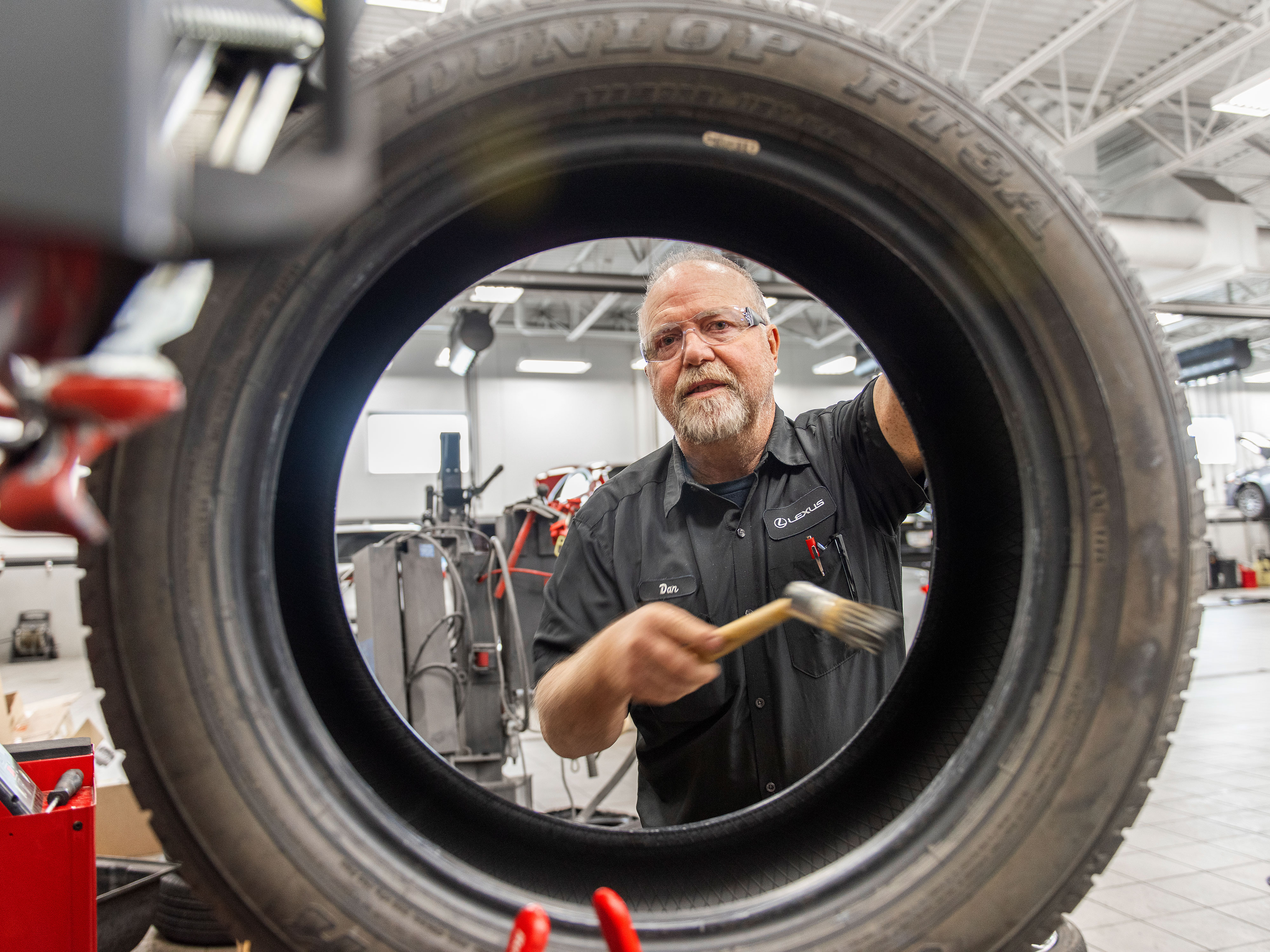 Technik obsługujący półautonomiczną montażownicę do opon Hunter Revolution